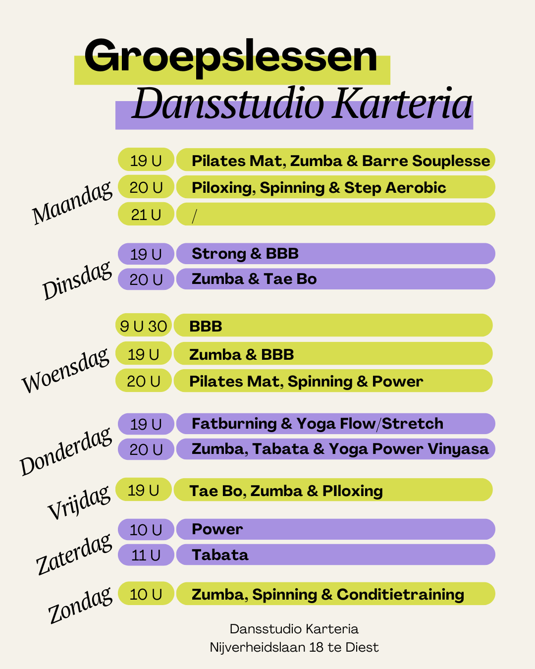 Dit lessenrooster geldt het hele jaar door. In de zomervakantie vallen er echter hier en daar lessen weg. Wil je op de hoogte blijven van welke dit zijn? Dan kan u best onze Facebookpagina volgen: https://www.facebook.com/KarteriaDiest.Sportcentrum.Dansstudio